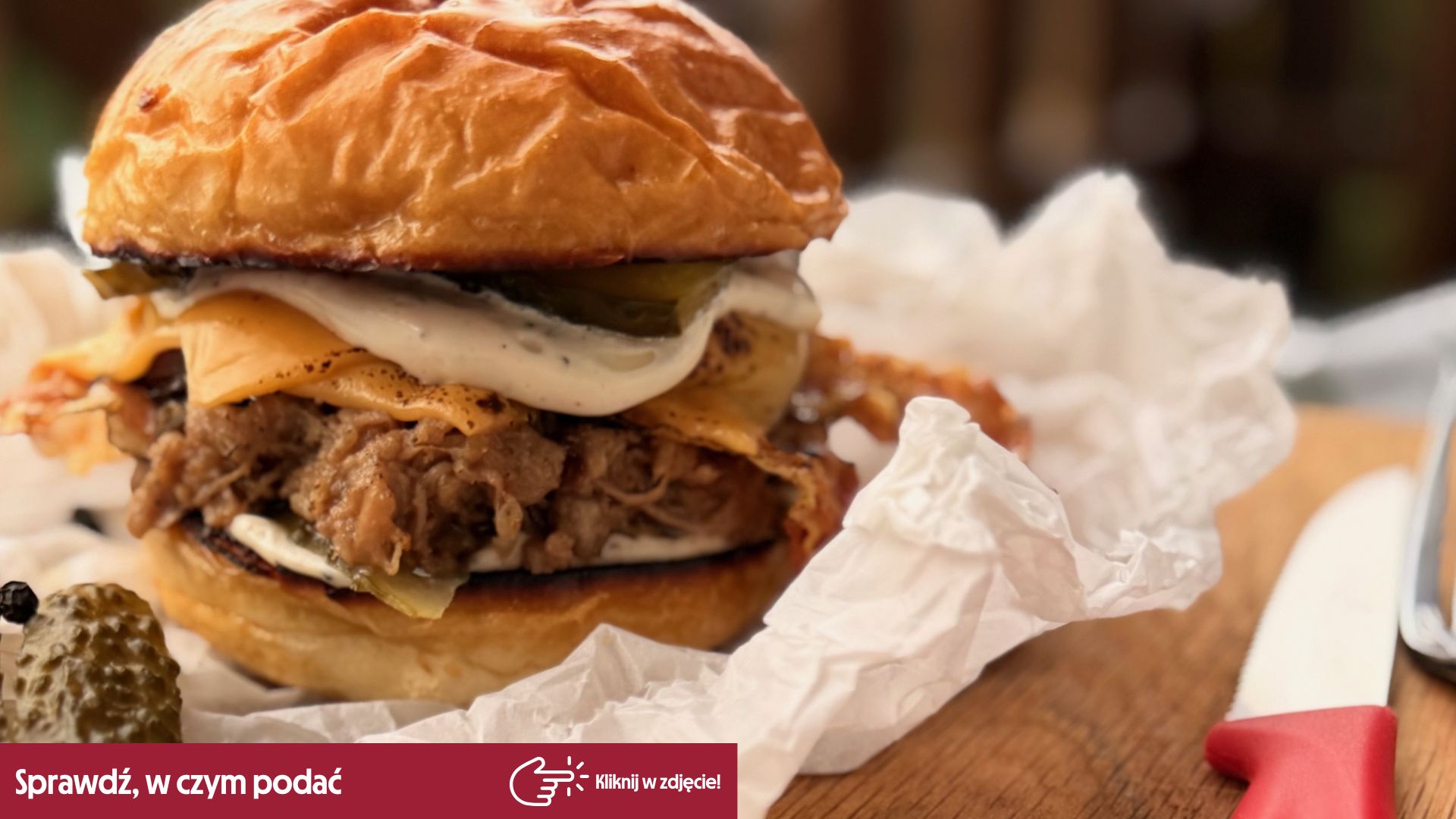 Burger z szarpaną kaczką to prawdziwie aromatyczny hit, obok którego nikt nie przejdzie obojętnie. Świeże bułeczki, placek ziemniaczany, ser i mięso z kaczki, razem z aromatycznymi warzywami tworzą wyjątkową kompozycję. Do przygotowania dania przyda Ci się patelnia. Przepis powstał we współpracy z Adamem Borowiczem.