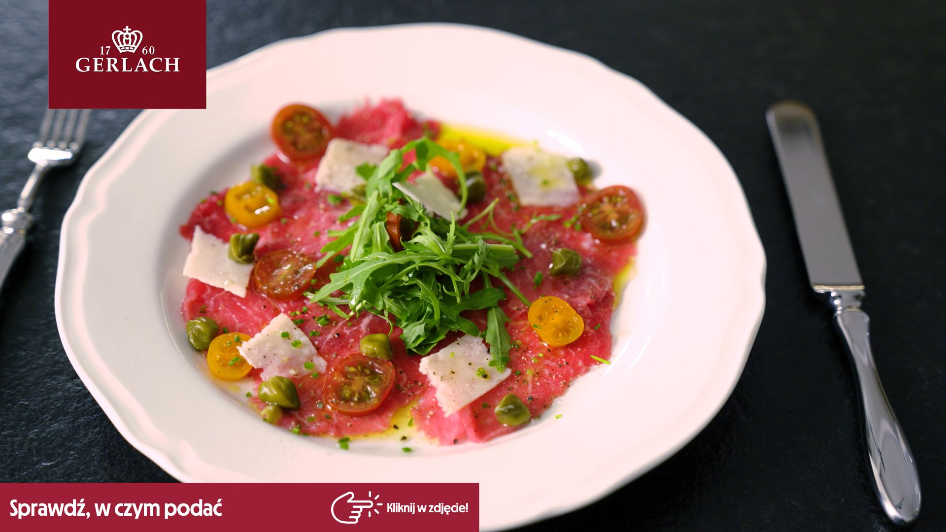 Ligawę zamroź dzień przed przygotowaniem dania. Następnie pokrój mięso na cienkie plasterki, używając do tego noża szefa kuchni PRECISION lub NATUR. Mięso ułóż na talerzu i skrop oliwą. Danie będzie szczególnie dobrze prezentować się na talerzu obiadowym RETRO. Kolor dania idealnie komponuje się z odcieniem kości słoniowej, jaki ma porcelana Royal Ivory Porcelain.