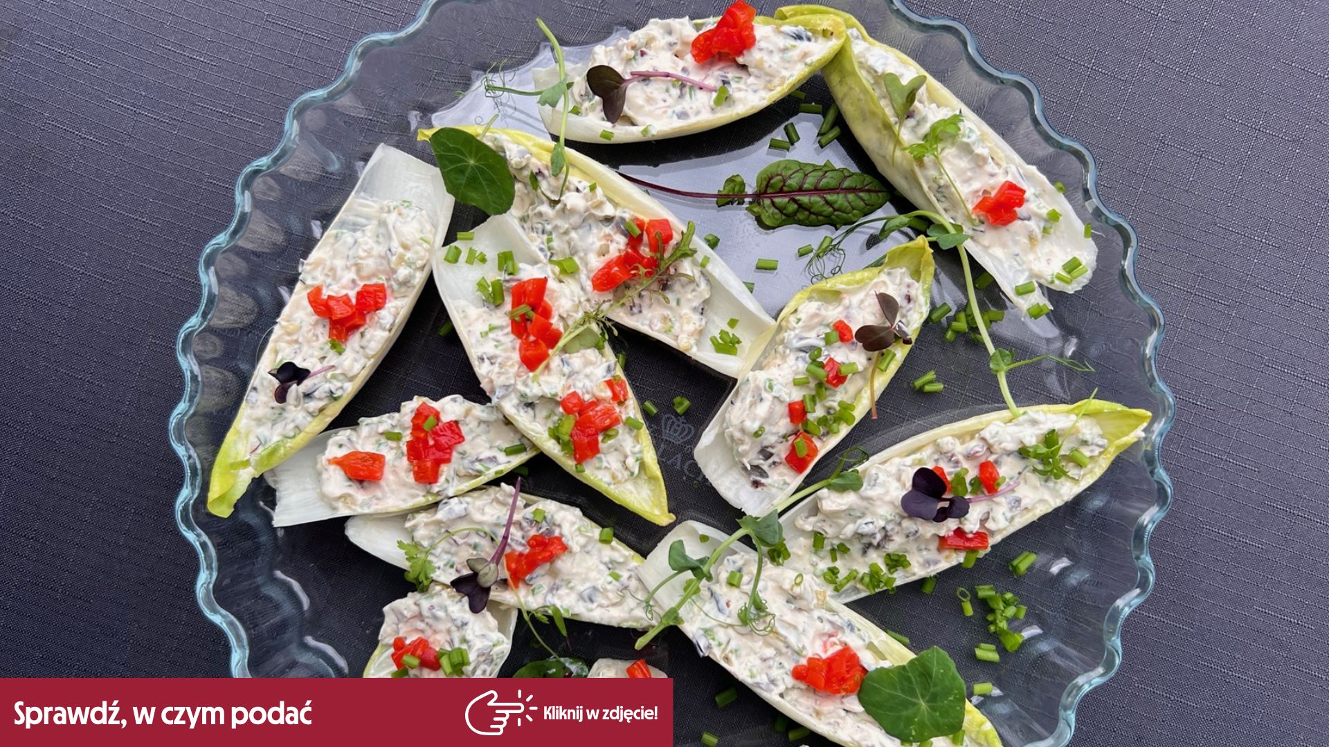 Faszerowana cykoria z serkiem i ogórkami to propozycja na przekąskę pełną smaku według Adama Borowicza. Jest chrupiąca i świetnie sprawdzi się na zimną płytę lub też do serwowania w trakcie rodzinnego wieczoru filmowego. Podasz ją w eleganckiej porcelanie, np. sięgając po wygodny półmisek lub płaski talerz. Innym dobrym pomysłem będzie wykorzystanie szklanego naczynia żaroodpornego, np. do tarty.