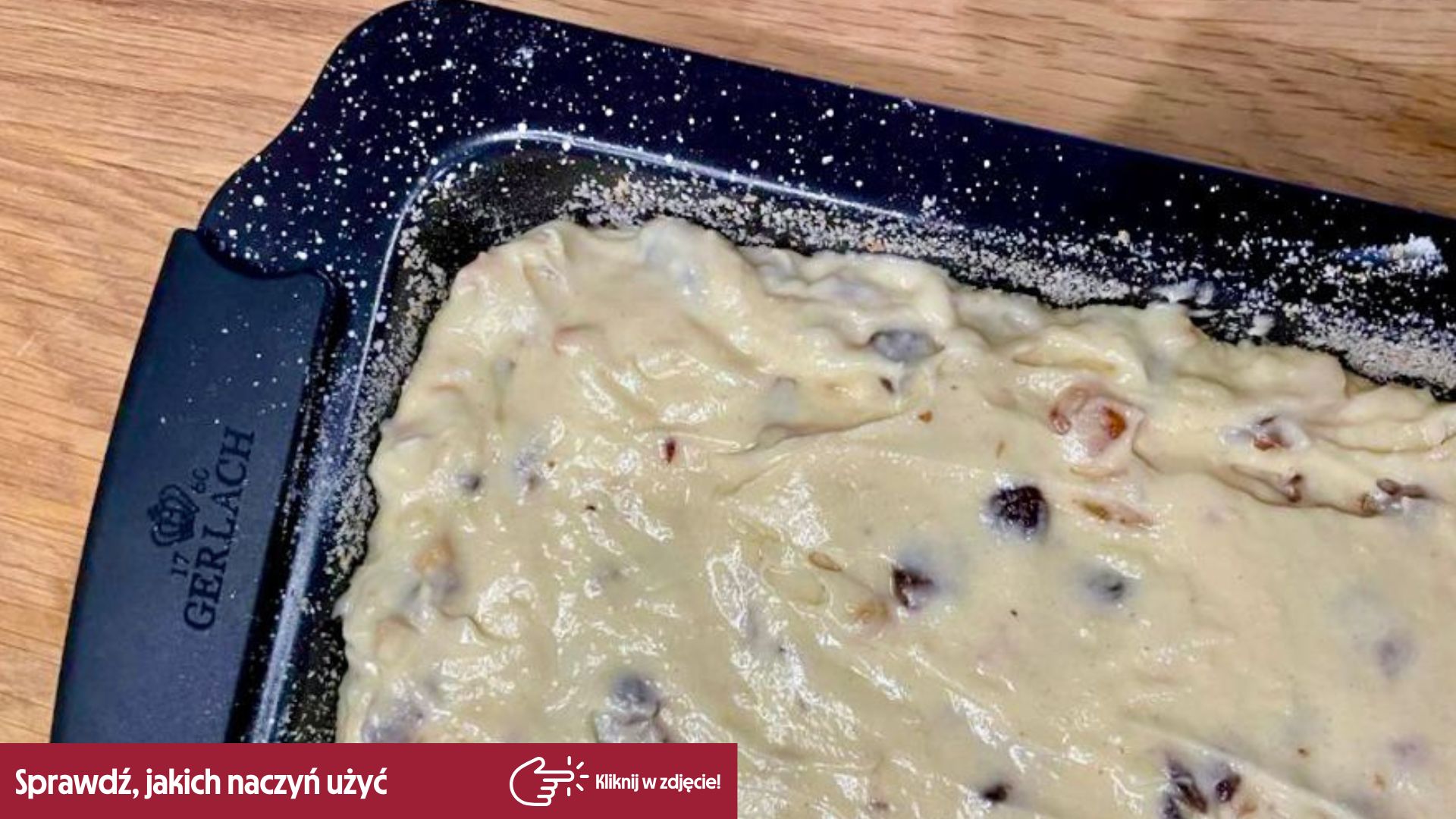 Białka ubij na sztywną pianę, a następnie dodaj je do masy i wymieszaj szpatułką lub drewnianą łyżką. Gdy masy się połączą, przełóż ciasto do foremki prostokątnej o długości 24 cm. Możesz wysmarować ją masłem i obsypać bułką tartą. Pamiętaj, aby wyrównać ciasto przed rozpoczęciem pieczenia.