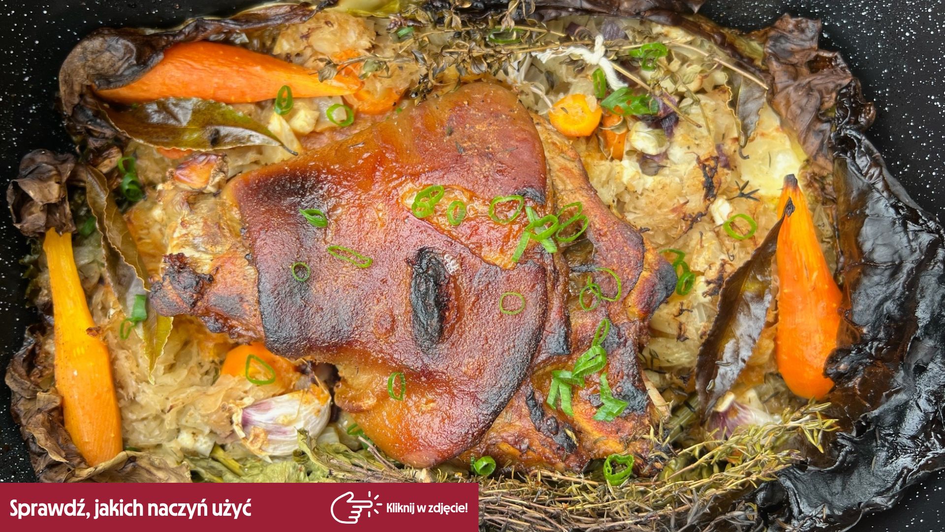 Odsączoną z wody kiszoną kapustę wymieszaj z plastrami marchewki oraz z cebulą pokrojoną w większą kostkę. Następnie odstaw na bok – będzie jeszcze potrzebna. Żaroodporną brytfannę Gerlach posmaruj smalcem. Jej spód i boki wyłóż liśćmi kapusty. Do tak przygotowanego naczynia przełóż przygotowaną kiszoną kapustę z marchewką, czosnkiem i cebulą. Na kapuście ułóż zamarynowane wcześniej golonki i przelej pozostałą marynatę. Dodaj świeże zioła: gałązki tymianku, lubczyku i liście laurowe. Całość oprósz solą i zalej szklanką piwa (najlepiej łagodny pils lub lager), może być 0%, jeśli ktoś preferuje.