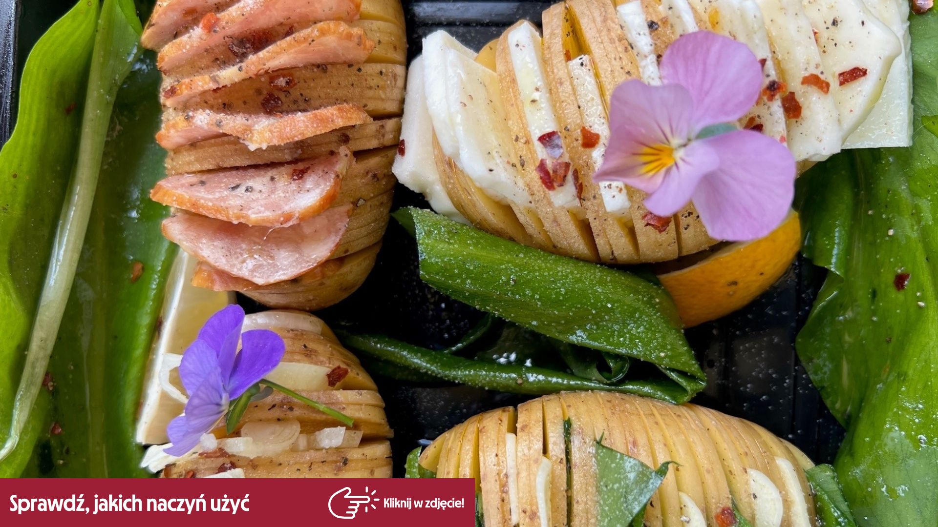 Jeśli chcesz w elegancki sposób podać pieczone ziemniaczki, wykorzystaj jadalne kwiaty (uwaga, muszą być przeznaczone do spożywania) oraz sosy. Za ich pomocą możesz stworzyć wyjątkowe, kolorowe kompozycje.