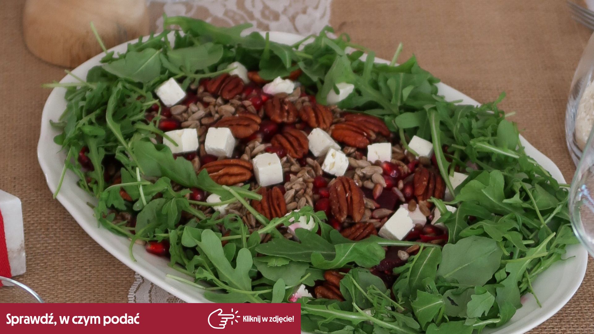 Przed podaniem na półmisku ułóż rukolę. Następnie wyłóż buraki z cebulą, ser feta, pestki słonecznika oraz granatu, a także orzechy. Smacznego!