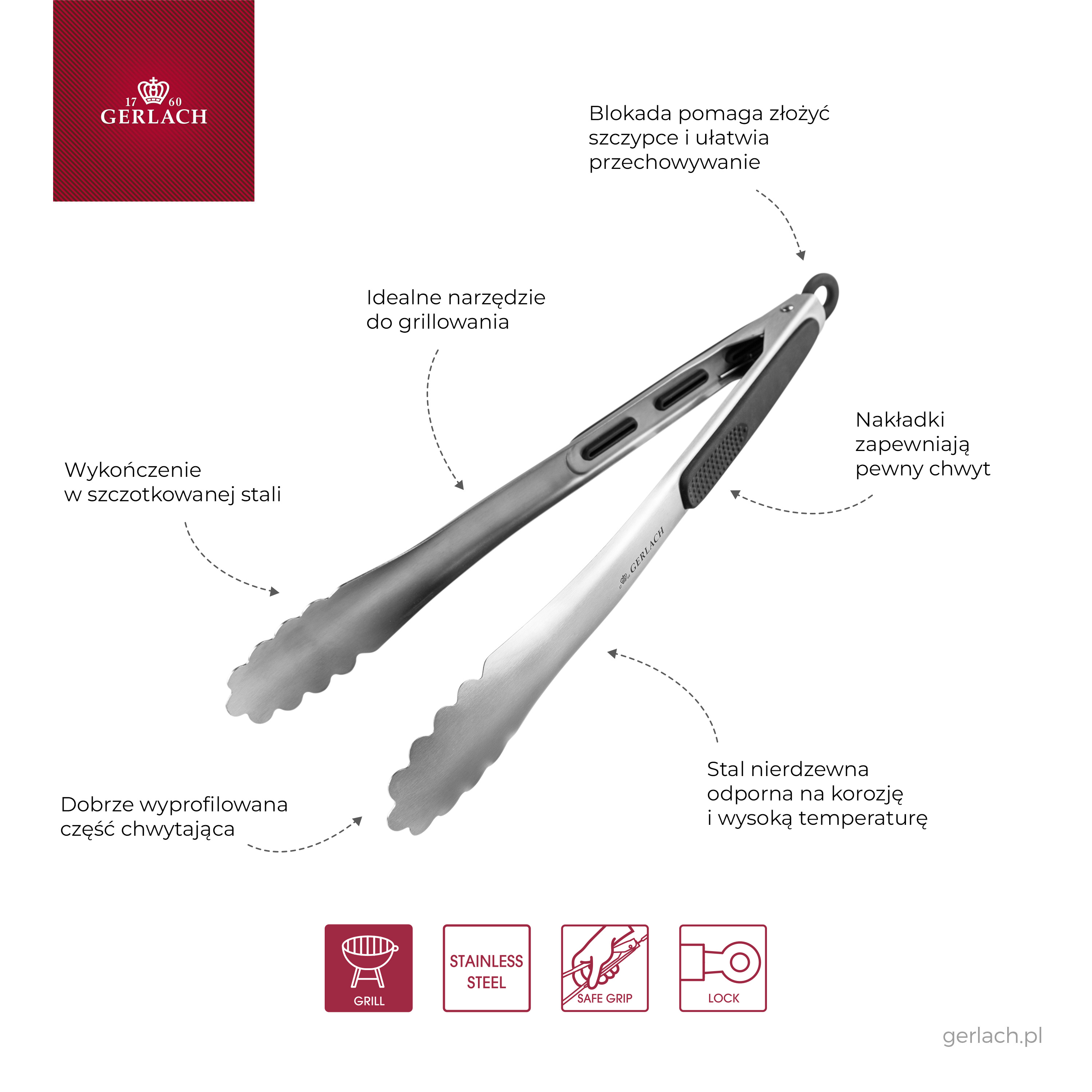 Szczypce zostały stworzone z myślą o użytkowaniu ich w trakcie grillowania na różnego rodzaju urządzeniach, np. elektrycznych czy gazowych. Długość 40 cm pozwala na utrzymanie odpowiedniej odległości od smażonych składników, co zwiększa bezpieczeństwo w trakcie pracy. Nie należy ich jednak stosować na patelniach z powłokami nieprzywierającymi, ponieważ stalowe końcówki mogą porysować ich powierzchnię.