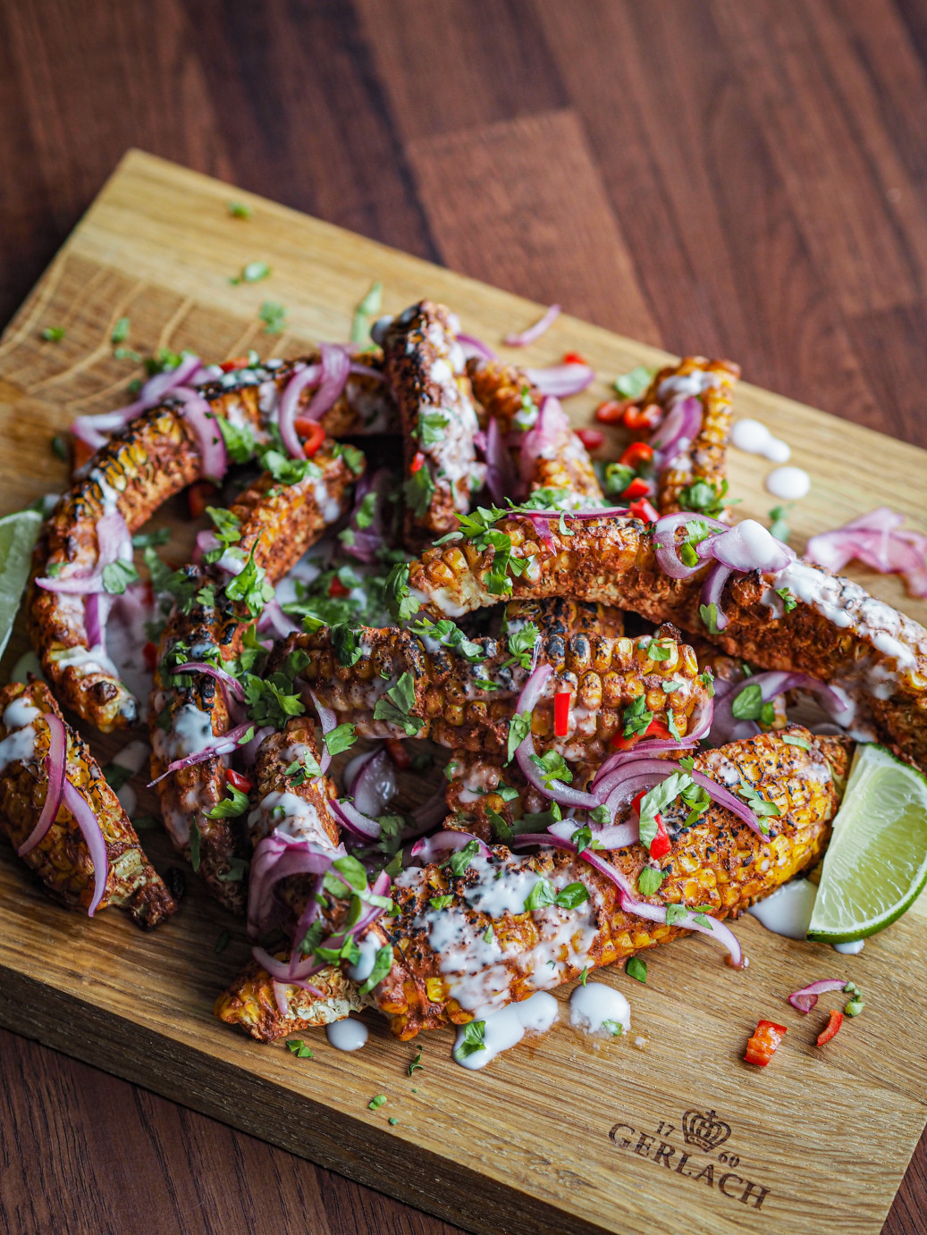 Kukurydzę po wyjęciu z piekarnika ułóż na talerzu, oblej śmietanką, obsyp kolendrą, chilli i pilkowaną cebulą, a na wierzchu skrop ją limonką. Smacznego!